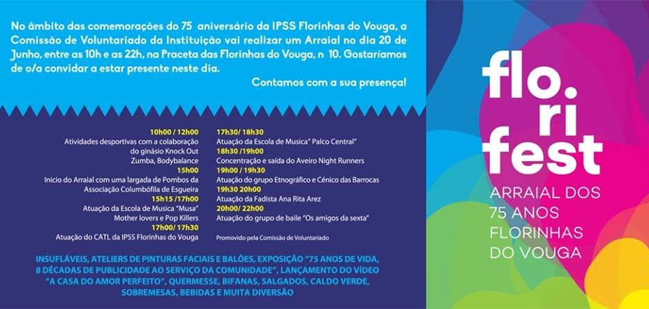 No âmbito das comemorações do 75º aniversário da IPSS Florinhas do Vouga, a Comissão de Voluntariado da Instituição vai realizar um Arraial no dia 20 de Junho, entre as 10h… Ler mais »Florifest