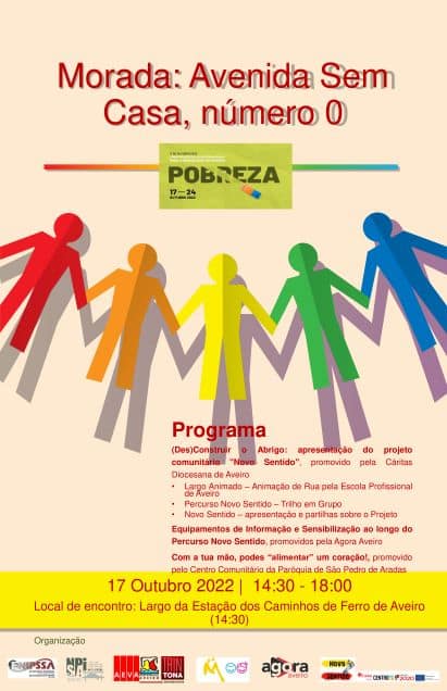 O NPISA de Aveiro vem endereçar o convite à comunidade aveirense para participar na iniciativa Morada: Avenida Sem Casa, Número Zero que irá realizar, em parceria com a Agora Aveiro – Associação para a Promoção da Cidadania Ativa, Escola Profissional de Aveiro (EPA) e Centro Comunitário da Paróquia de São Pedro de Aradas. Trata-se de uma intervenção em espaços públicos, que decorrerá no dia 17 de outubro, das 14:30 às 18:00, em diversos locais da União de Freguesias de Glória e Vera Cruz, da Freguesia de Esgueira e da Freguesia de Aradas. A iniciativa tem como objetivo alertar os/as cidadãos/ãs para a existência de pessoas em situação de sem-abrigo e dar a conhecer o trabalho que é desenvolvido a nível local em prol da resolução dos problemas que as afetam.