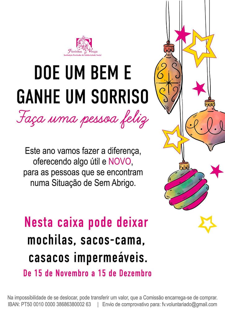 Nesta época junte-se a nós, promovendo a nossa campanha de Natal junto da vossa Empresa. Lançamos o desafio e com a vossa colaboração vamos conseguir ganhar muitos sorrisos e fazer várias pessoas felizes. Para qualquer esclarecimento, contactar através do email, fv.voluntariado@gmail.com ou telemóvel 966257603. Pode também deixar a sua oferta na secretaria da Instituição, ou através de donativo cujo IBAN se encontra no cartaz, que a Comissão de Voluntariado se encarrega de comprar (envio de comprovativo para o email mencionado, para posterior emissão do recibo de donativo).Brevemente divulgamos os Ponto de Recolha