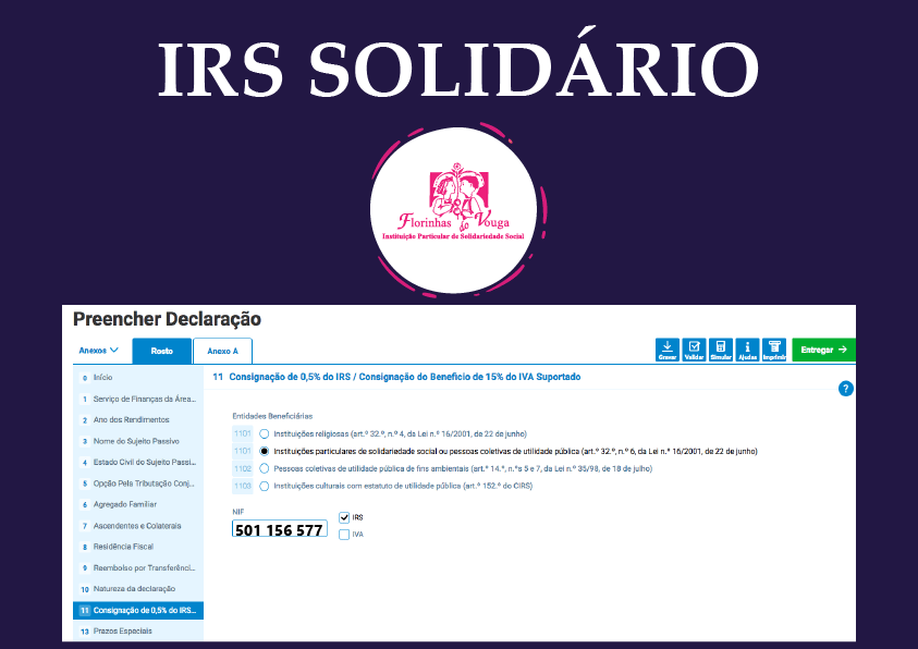 Sabia que pode doar 0,5% dos impostos à IPSS Florinhas Do Vouga? – Assinale no modelo 3, quadro 11, Instituição de Solidariedade Social, e no campo 1101 escreva o NIF 501… Ler mais »IRS Solidário